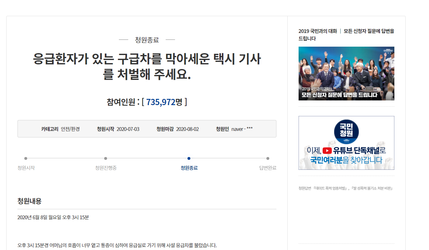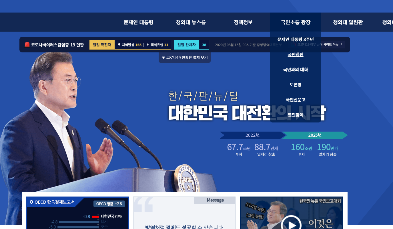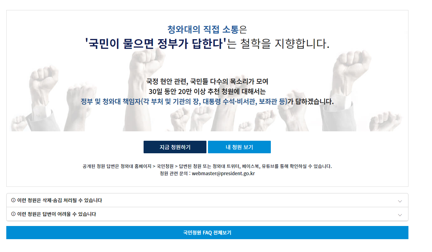 청와대 홈페이지 링크는 글 하단에 있으니까 참고하시고요. 국민소통 광장 메뉴에서 국민청원으로 들어가시면 됩니다.