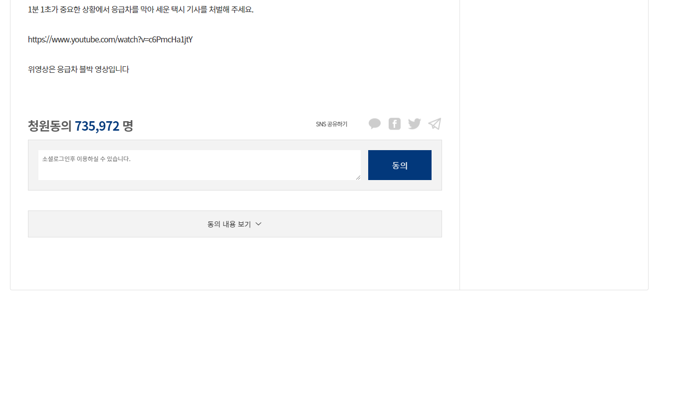 청와대 국민청원 홈페이지에서 직접 청원을 올릴 수도 있고 다른 사람들이 올린 국민청원에 동의할 수 있습니다. 국민 하나하나 힘을 모아서 대한민국을 바꿀 수 있기를!!