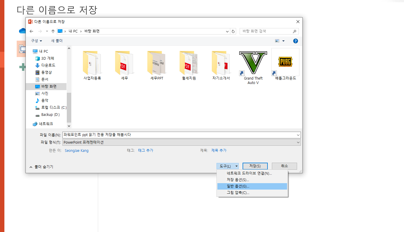 이제부터가 중요합니다 발표자료 파워포인트 파일을 읽기 전용으로 저장하려면 저장하실 때 도구 메뉴를 열어서 '일반 옵션'으로 들어가주세요.