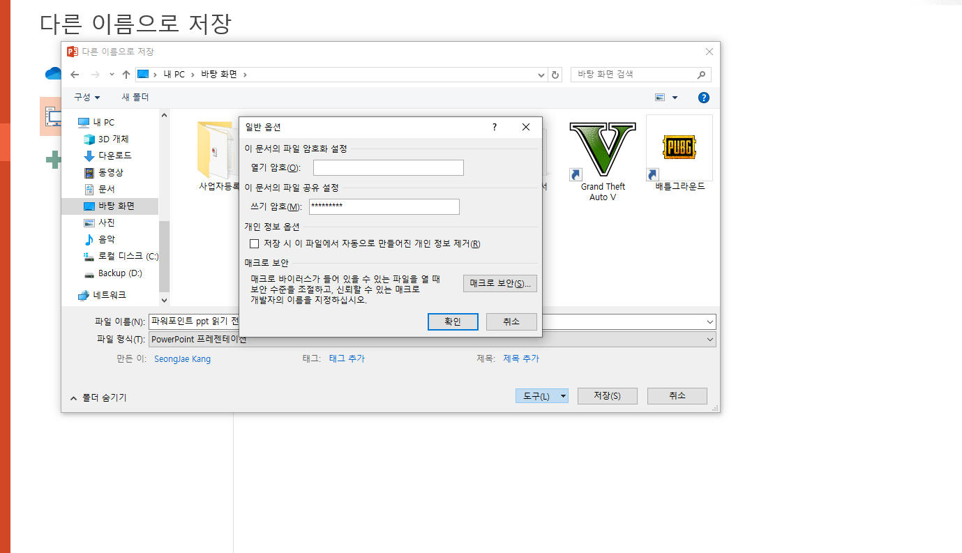 여기서 열기 암호와 쓰기 암호를 설정할 수 있는데요. 열기 암호를 걸어두시면 PPT를 수정하는 것뿐만 아니라 여는 거도 비밀번호를 입력해야 할 수 있는 거예요. 우리는 읽기 전용으로 저장하고 싶은 것이니 쓰기 암호를 걸어두시면 됩니다. 그러면 비밀번호를 알고 있는 사람만 파워포인트 파일을 수정할 수 있고 비밀번호를 모르는 사람은 ppt 자료를 읽기만 할 수 있는 것이지요.