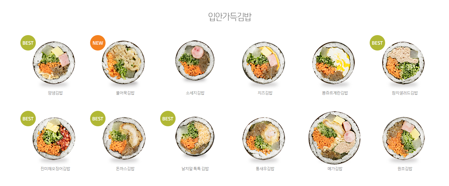 우선 얌샘김밥 메뉴 중에서 김밥 소개해드릴게요. 역시 얌샘답게 김밥이 참 많은데요. 어묵김밥, 소세지김밥, 치즈김밥, 참치샐러드김밥, 진미채오징어김밥, 돈까스김밥 등 다양한 종류의 김밥이 있습니다.