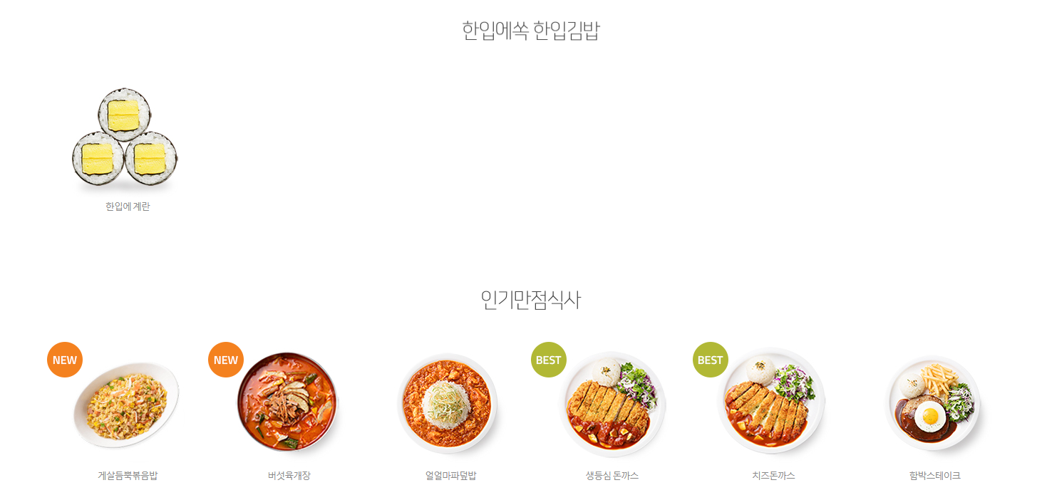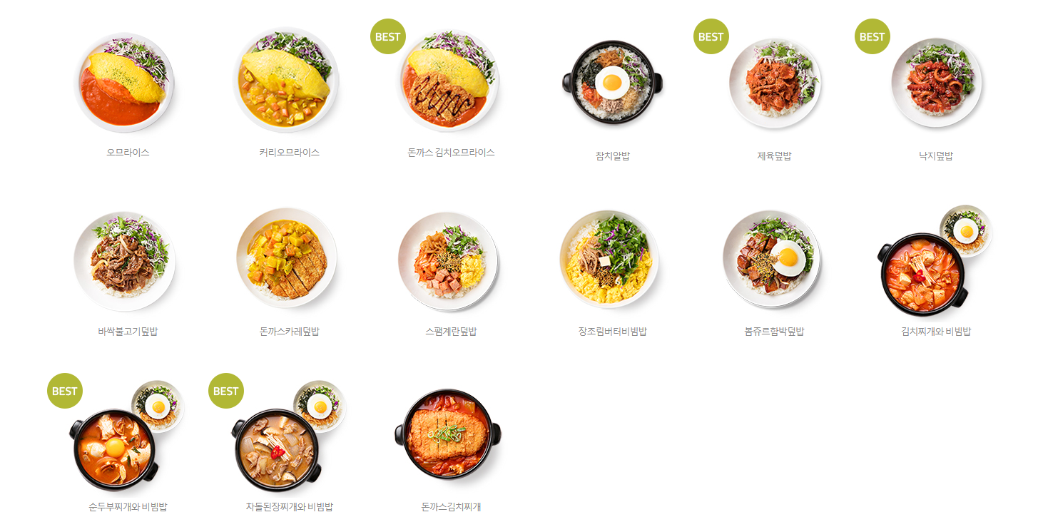 얌샘김밥 메뉴 중에서는 제가 좋아하는 오므라이스도 있어요!! 참치알밥, 제육덮밥, 낙지덮밥, 바싹불고기덮밥, 돈까스카레덮밥, 스팸계란덮밥, 봉쥬르함박덮밥, 김치지개와 비빔밥 등의 든든한 식사 메뉴도 있답니다.