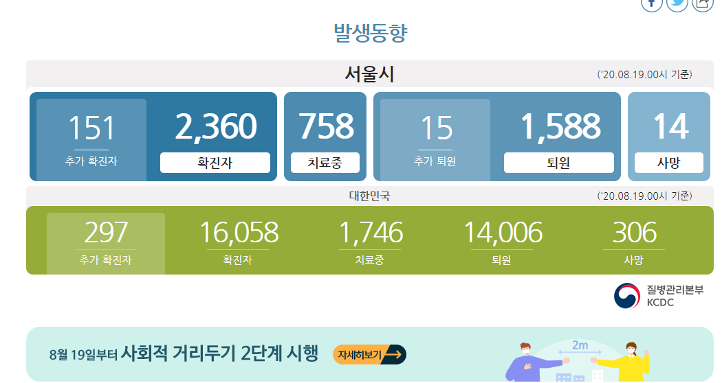 서울시 코로나 사이트로 이동하시게 되면 이렇게 발생동향을 볼 수 있는데요. 확진자 수, 치료중인 환자 수, 추가 확진자 수, 추가 퇴원자 수, 퇴원 수, 사망 수를 볼 수 있습니다. 대한민국 전체 현황도 볼 수 있고요. 8월 19일부터는 사회적 거리두기 2단계가 시행되고 있는데 이에 대한 자세한 내용을 볼 수 있습니다.