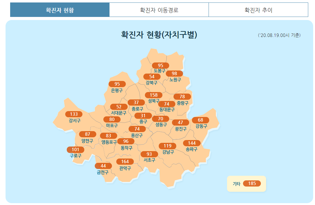 물론 강서구, 은평구, 서대문구 ,종로구, 강북구 ,성북구, 도봉구, 노원구, 동대문구 ,중랑구, 마포구, 용산구, 중구, 성동구, 광진구, 강동구, 양천구, 영등포구, 동작구, 구로구, 서초구, 강남구, 송파구, 관악구, 금천구 별로 나오기도 하고요. 발생 분류에 따라서 해외접촉 관련, 성북구 사랑제일교회, 용인시 우리제일교회, 양천구되새김교회, 노원구 안디옥교회, 관악구 요양병원, 고양시 반석교회(케네디상가), 강서구 요양시설 관련, 리치웨이 관련, 이태원 클럽 관련, 구로구 콜센터 관련 등으로 나옵니다.