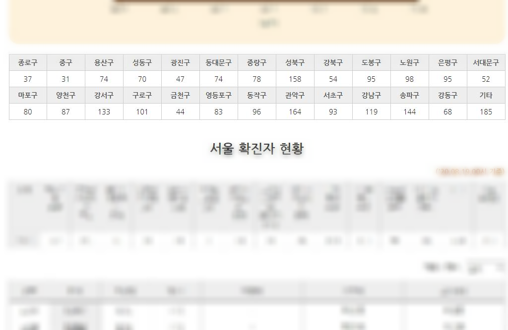 서울시 코로나 확진자 현황입니다. 강서구, 은평구, 서대문구 ,종로구, 강북구 ,성북구, 도봉구, 노원구, 동대문구 ,중랑구, 마포구, 용산구, 중구, 성동구, 광진구, 강동구, 양천구, 영등포구, 동작구, 구로구, 서초구, 강남구, 송파구, 관악구, 금천구 별로 나옵니다. 이렇게 서울특별시 자치구별로 볼 수 있어요.