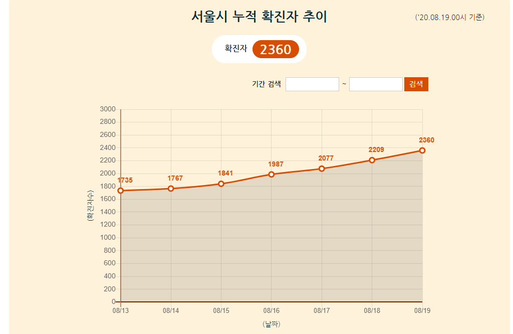 홈페이지에서는 누적 확진자 추이도 볼 수 있어요.
