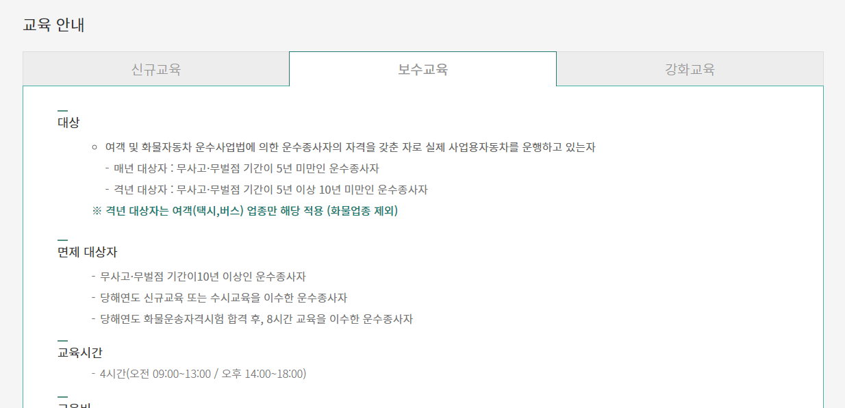 경기도교통연수원 홈페이지에서는 신규교육, 보수교육, 강화교육에 대한 안내를 받을 수 있는데요. 보수교육은 여객자동차와 화물자동차 운수종사자의 자격을 갖춘 자가 실제로 사업용자동차를 운행할 때 받는 교육인데요. 매년 대상자는 무사고 무벌점 기간이 5년 미만인 운수종사자입니다. 그리고 격년 대상자는 무사고 무벌점 기간이 5년 이상에서 10년 미만인 사람이고요. 면제 대상자도 확인해보시기 바랍니다.