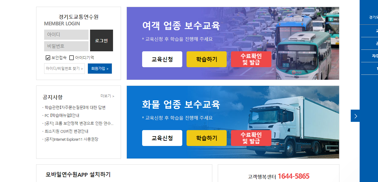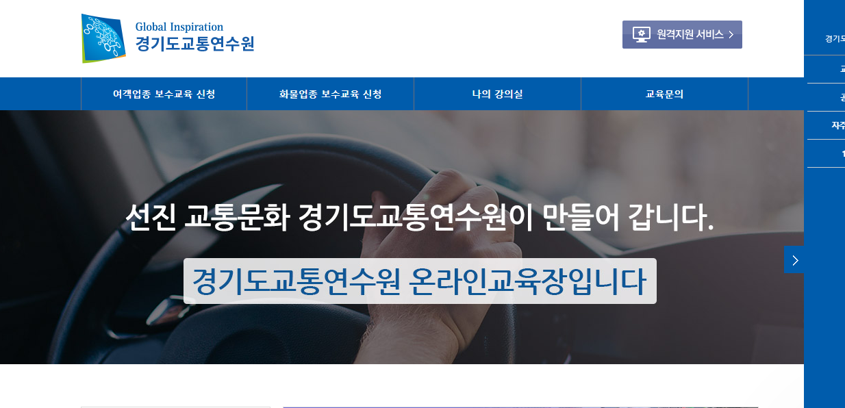 경기도교통연수원 홈페이지에 있는 온라인교육장입니다. 여객업종 보수교육 신청, 화물업종 보수교육 신청을 할 수 있고 강의를 수강할 수 있습니다.
