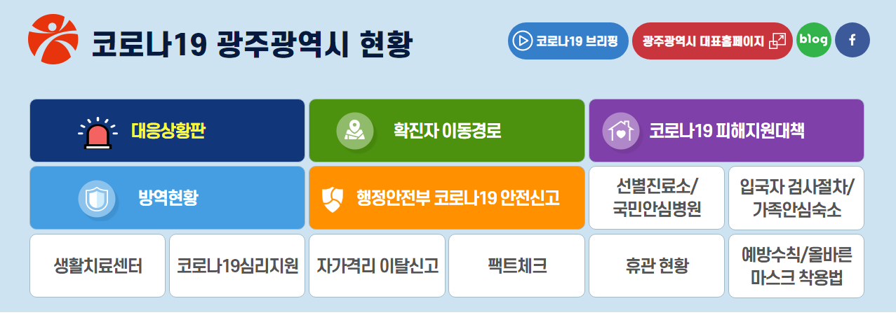 광주광역시 코로나 홈페이지에서는 대응상환판, 확진자 이동경로, 코로나19 피해지원대책, 방역현황 등을 제공하고 있는데요. 선별진료소/국민안심병원에 대한 안내도 받을 수 있어요.