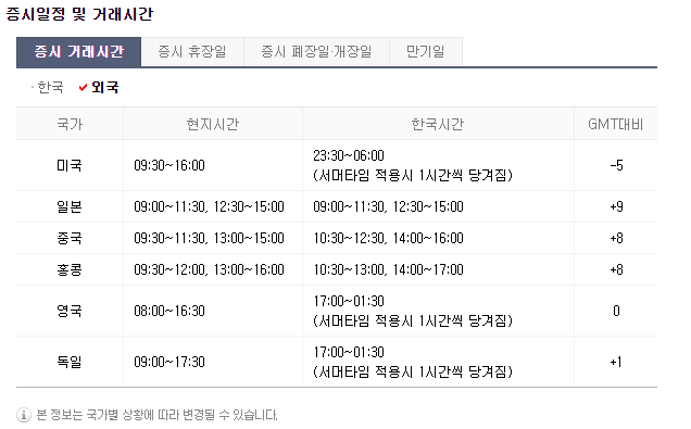 미국 주식 시간은 현지시간으로 오전 9시 30분부터 16시까지인데요. 우리나라 시간 기준으로 23시 30분에서 오전 6시까지입니다. 일본과 중국 주식 개장 및 폐장 시간은 우리나라와 비슷하고요. 홍콩, 영국, 독일 등의 국외 주식 시장의 거래 시간은 위 사진을 참고해주세요. 단순 참고용으로만 확인하시고 정확한 시간은 각 거래소 홈페이지에서 확인하시는 것이 좋습니다.