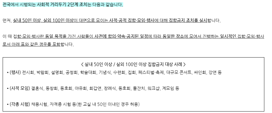 코로나 바이러스로 인하여 사회적 거리두기가 실시되는데요. 현재 8월 23일부터 사회적 거리두기 2단계가 전국적으로 시행되고 있습니다. 사회적 거리두기 2단계 기준 및 내용에 대해서 명확히 알아두는 것이 필요한데요. 실내50인 이상, 실외 100인 이상 대면으로 모이는 집합, 모임, 행사 등의 집합금지 조치가 실시됩니다.