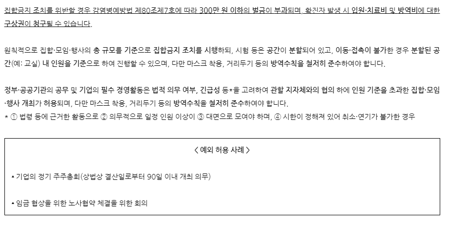 물론 기업의 정기 주주총회, 임금 협상을 위한 노사협약을 위한 회의 등의 불가피한 경우는 허용이 됩니다.