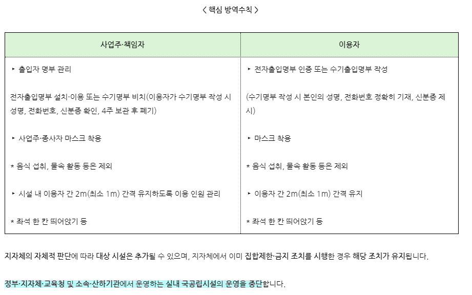 코로나 사회적 거리두기 2단계 핵심 방역수칙입니다. 사업주 및 책임자는 출입자 명부를 관리해야하고 이용자는 이를 작성해야하고 마스크도 착용해야합니다.
