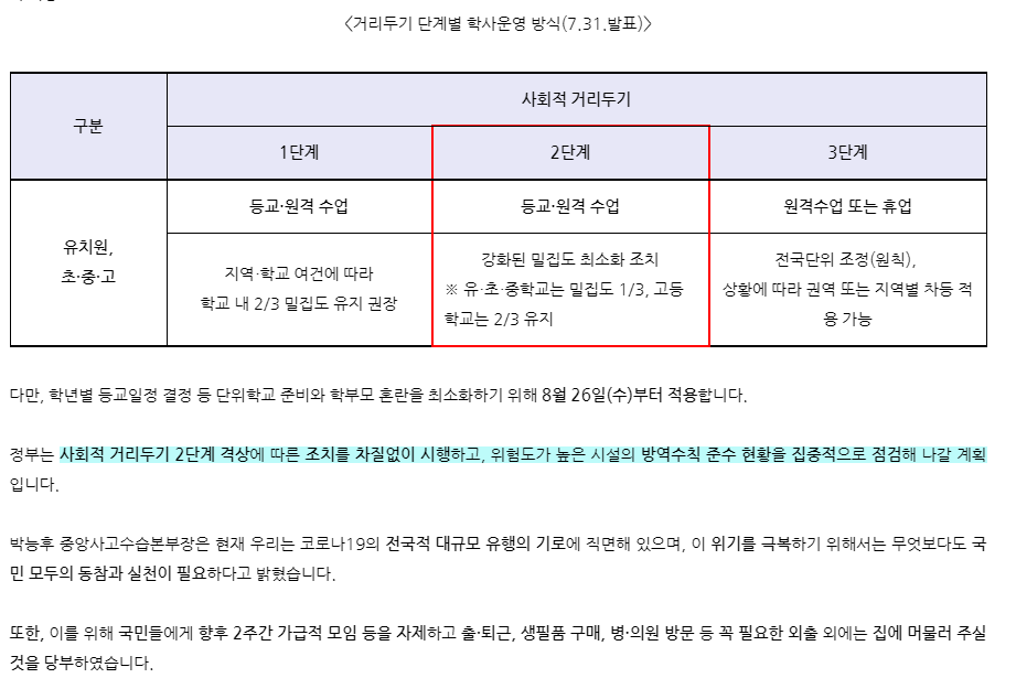 유치원, 초등학교, 중학교, 고등학교의 경우 사회적 거리두기 2단계 기준으로는 등교 및 원격 수업이고요. 밀집도 최소화 조치가 취해집니다. 자세하고 정학환 사회적 거리두기 2단계 기준 및 내용은 보건복지부 블로그의 글을 참고하시기 바랍니다.
