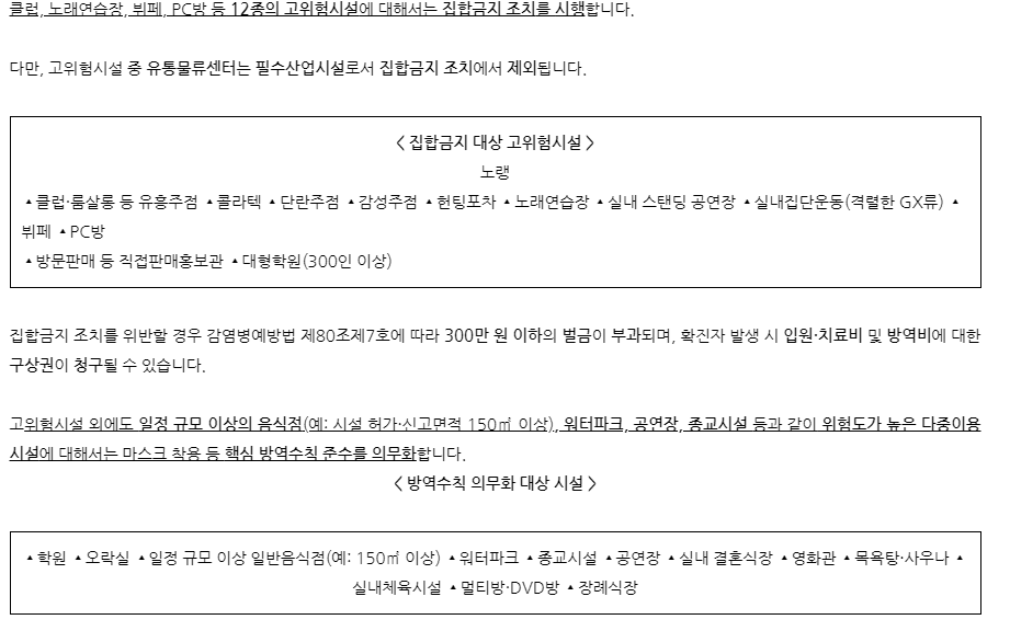 그리고 고위험시설에 대한 내용입니다. 클럽, 노래연습장, 뷔페, PC방 등 12종 고위험시설에 대해서는 집합금지 조치가 시행되는데요. 이에는 클럽, 룸살롱 등 유흥주점, 콜라텍, 단란주점, 감성주점, 실내집단운동(격렬한 GX류), 헌팅포차, 감성주점, 노래연습장, 실내 스탠딩 공연장 등이 포함됩니다.