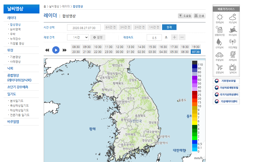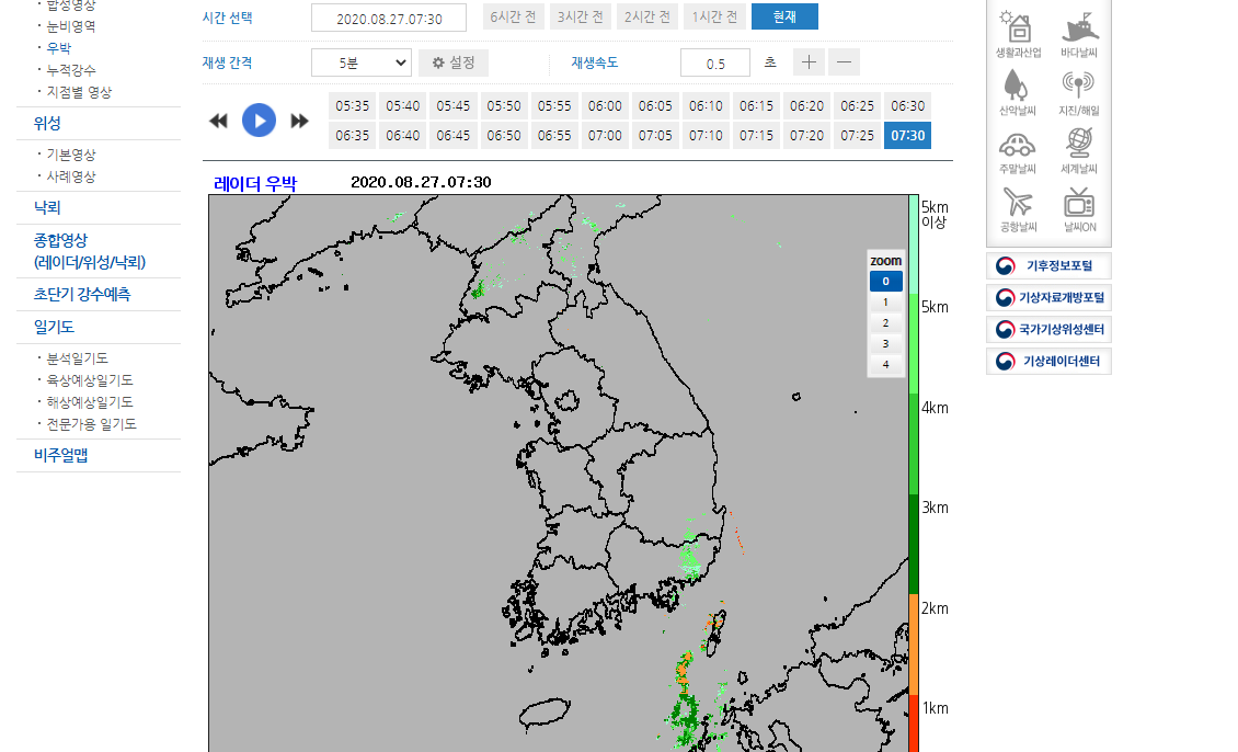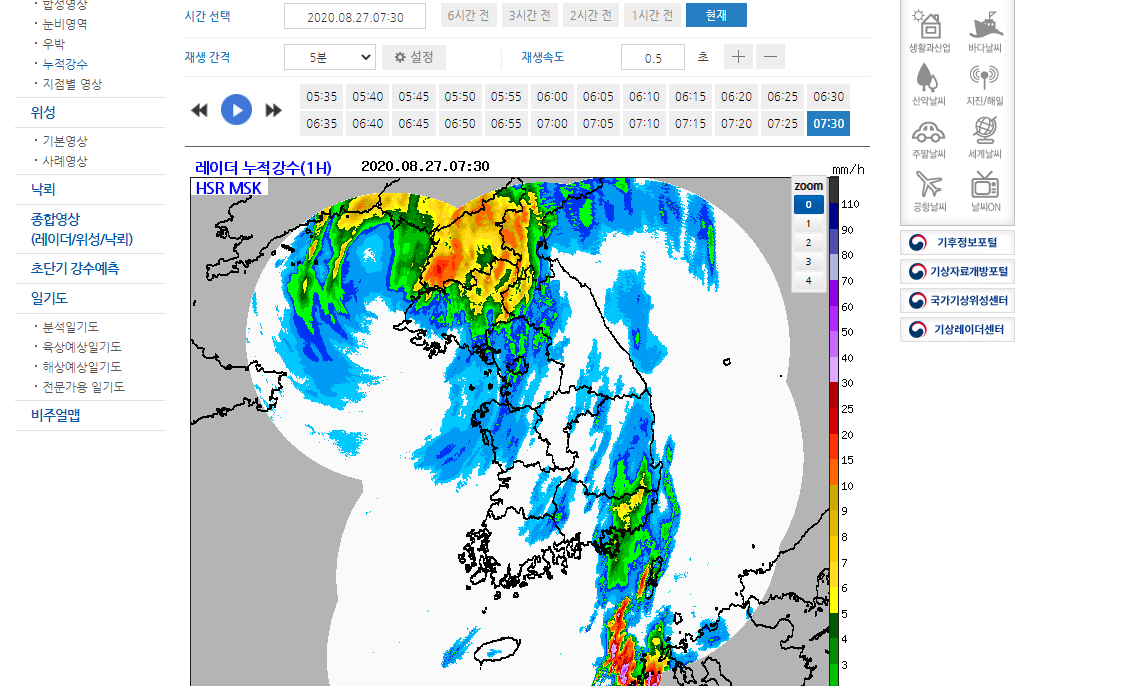 누적 강수도 볼 수 있고요. 기상청 홈페이지에 있는 레이더영상을 통해서 현재 날씨를 확인하는 법을 알아보았습니다. 지금 태풍이 또 북상하고 있다고 하는데요. 다들 안전 유의하시기 바랍니다.
