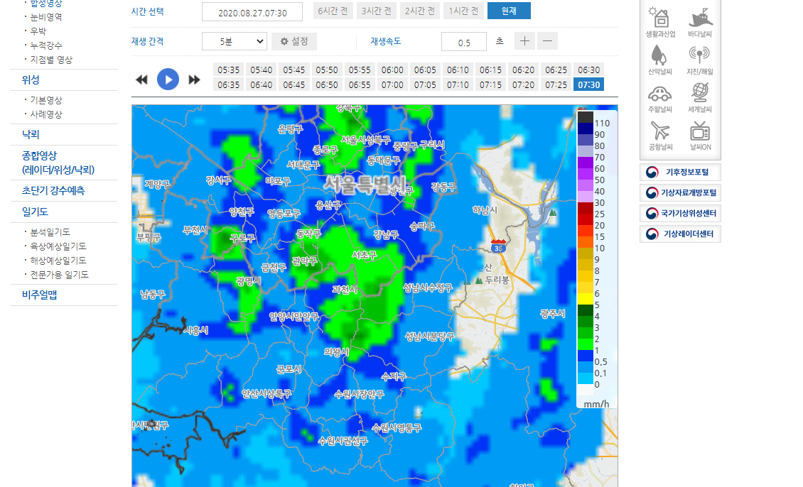 재생 간격을 넓혀서 시간 간격을 주게 되면 과거 레이더영상과 현재 레이더영상을 비교해서 앞으로 비가 올지 안올지도 예상할 수 있습니다.