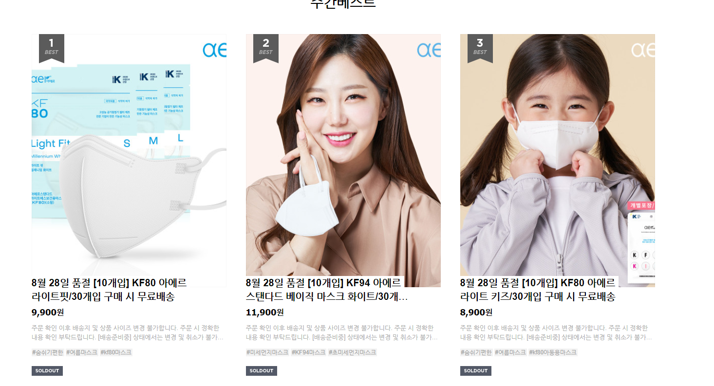 아에르 스마트스토어에서는 KF94 마스크를 판매하고 있는데요. 1시간 만에 품절되기도 합니다. 그만큼 마스크의 수요는 엄청난데요. 마스크 대란인데도 균일가를 유지하며 착한 마스크로 불리는 아에르 마스크 쇼핑몰. 방금 전에 아에르샵에 들어가봤는데 마스크가 품절이더라고요. ㅠㅠ