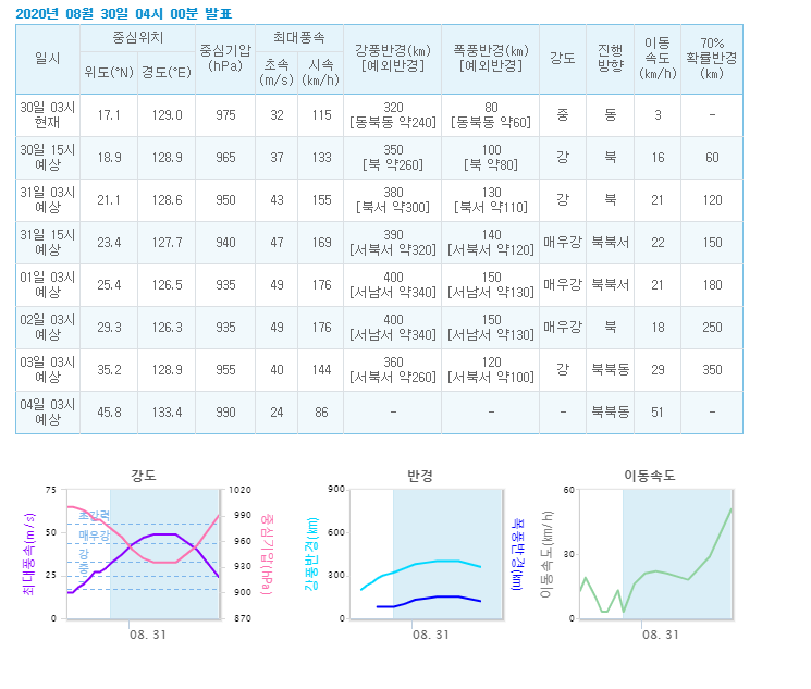 태풍 마이삭의 강도, 반경, 이동속도도 그래프로 나와 있네요.