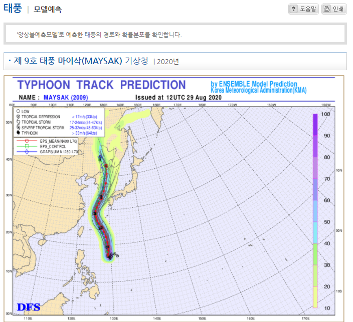 기상청의 앙상블예측모델로 발표된 제9호 태풍 마이삭의 예상 이동 경로입니다. 참고하시기 바랍니다.