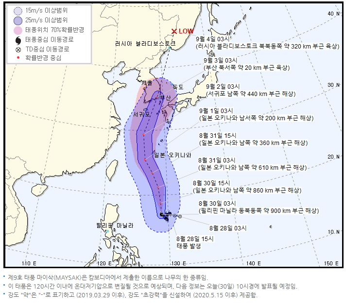 홈 > 태풍 > 태풍정보 > 통보문 |날씨|태풍|태풍정보|통보문 --> 제 9호 태풍 마이삭(MAYSAK) 기상청 | 2020년 08월 30일 04시 00분 발표 태풍 3일예보 일시 중심위치 중심기압(hPa) 최대풍속 강풍반경(km)[예