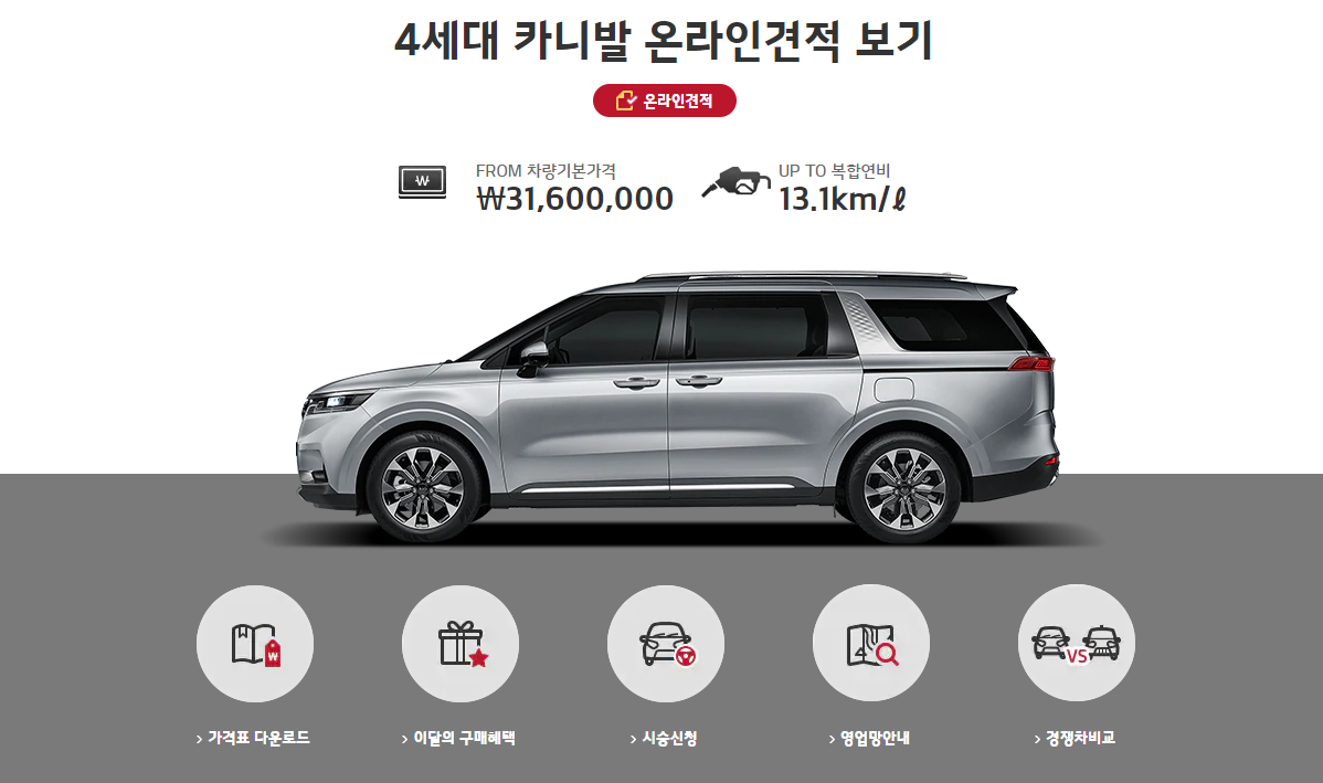 기아자동차 홈페이지로 이동하시면 카니발 가격표 다운로드 가능하시고요. 구매혜택도 살펴보실 수 있어요. 시승신청도 하실 수 있고요. 차량 기본 가격은 31,600,000원입니다. 홈피에서 온라인 견적도 내보실 수 있어요.