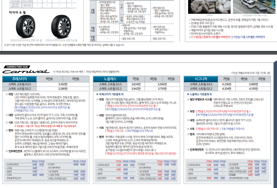 패밀리카로 원탑이라고 할 수 있는 카니발. 가격표는 기아자동차 사이트에서 볼 수 있는데요.