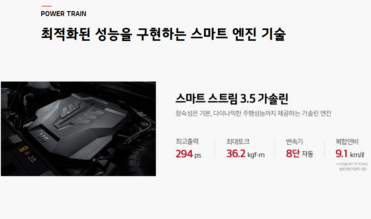신형 카니발 가격표는 기아차 사이트에서 볼 수 있는데요. 와우...!! 일단 스마트 스트림 3.5 가솔린 엔진이 차량에 탑재되어 있는데요. 가솔린 엔진이라서 정숙하고 좋다고 하네요. 최고출력은 294ps이고 최대토크는 36.2kgfm입니다.