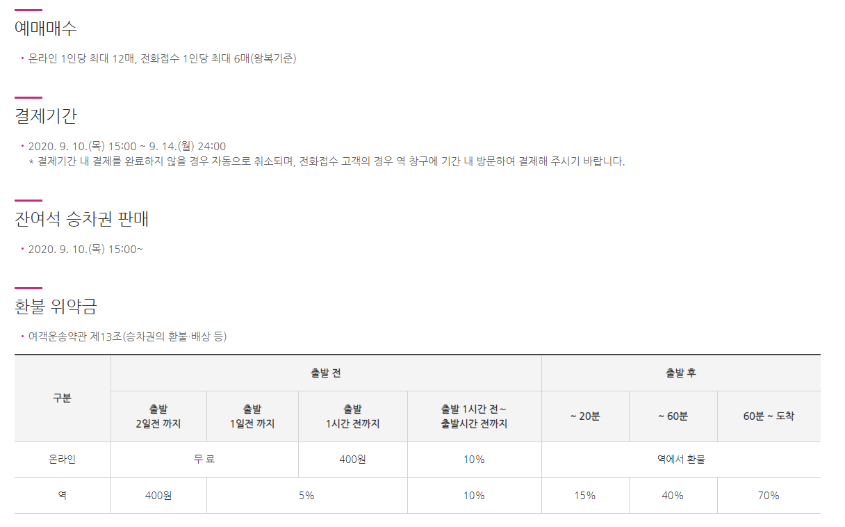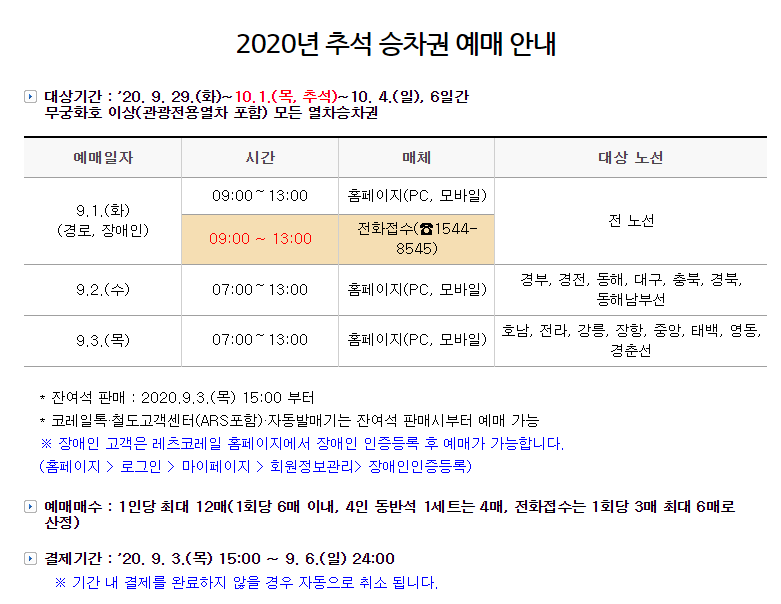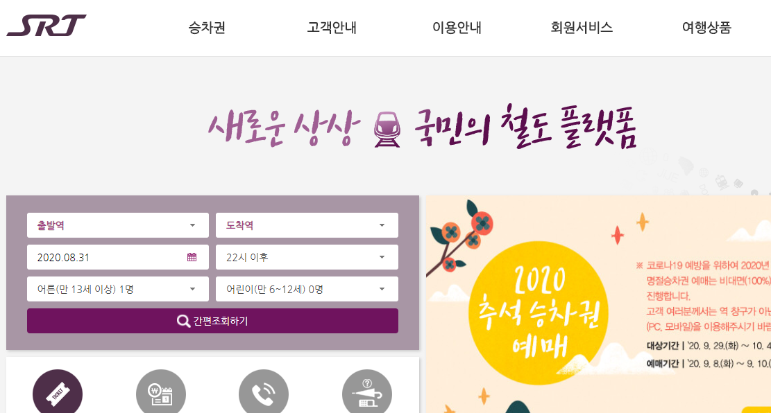 2020년 추석 승차권 예약 전용 홈페이지
