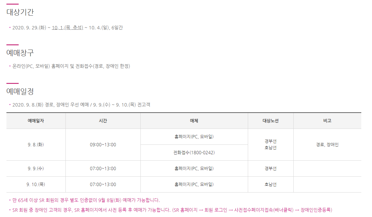 9월 8일부터 9월 10일까지 기차표 예약이 진행됩니다. 자세한 내용은 SRT 홈페이지 참고하시기 바랍니다. 만65세 이상의 SR 회원은 별도 인증 없이 예매 가능합니다.