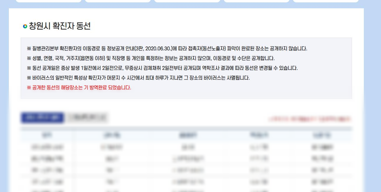 창원시 확진자 동선 ※ 질병관리본부 확진환자의 이동경로 등 정보공개 안내(3판, 2020.06.30.)에 따라 접촉자(동선노출자) 파악이 완료된 장소는 공개하지 않습니다. ※ 성별, 연령, 국적, 거주지(��