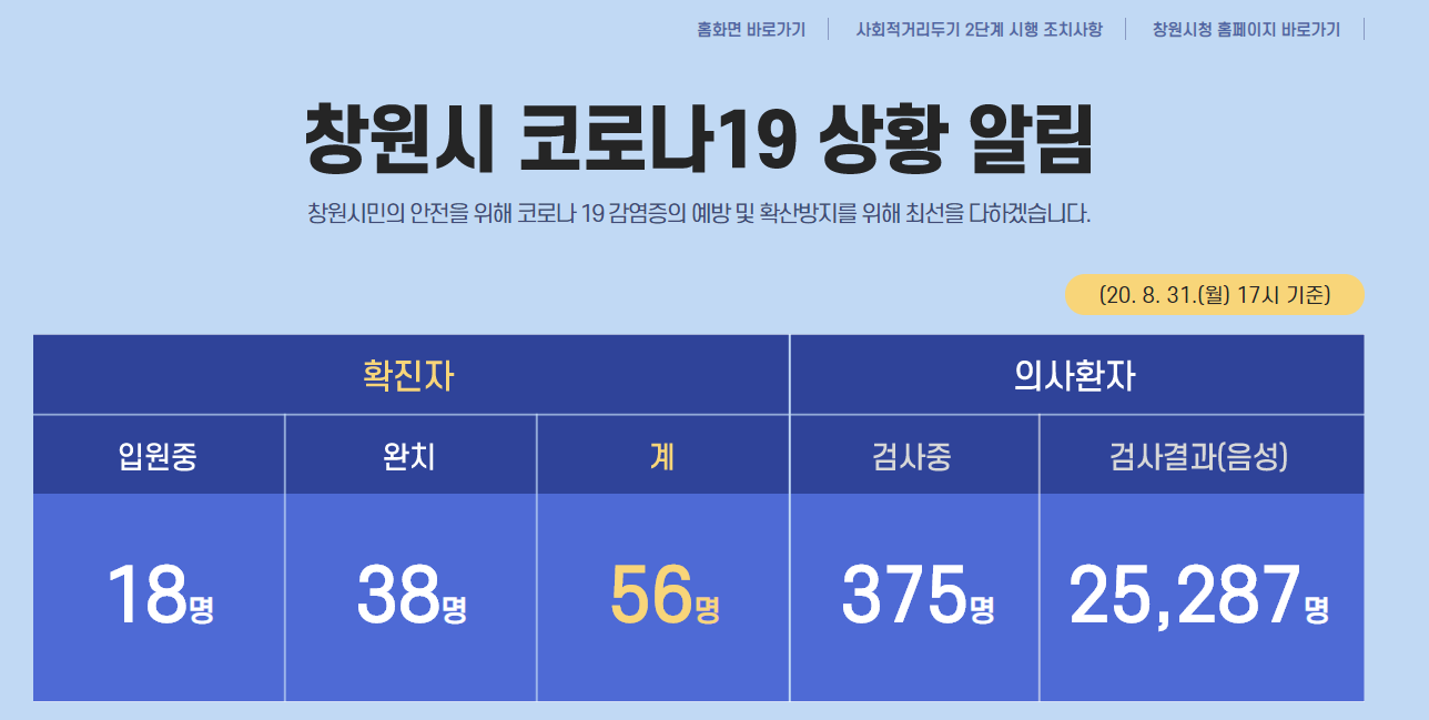 경남 창원 코로나 확진자 동선 및 현황를 한눈에 볼 수 있습니다. 확진자 입원중 수, 완치자 수를 확인할 수 있고요. 검사 현황에 대해서도 볼 수 있습니다.