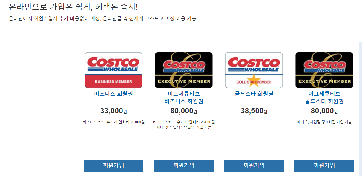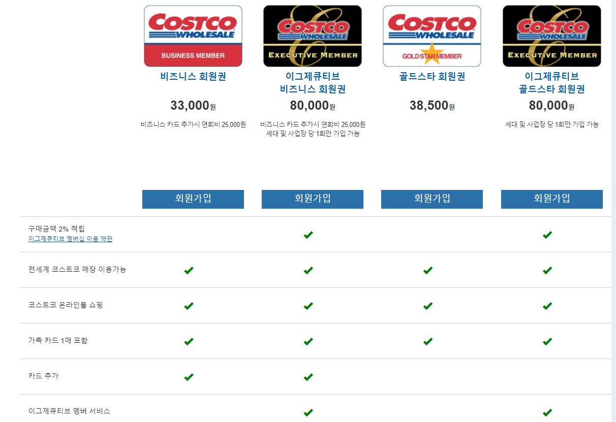 코스트코 멤버십의 연회비 알아보겠습니다. 비즈니스 회원권은 33,000원이에요. 이그제큐티브 비즈니스 회원권 연회비는 80,000원이고요. 골드스타 회원권의 가격은 38,500원입니다.