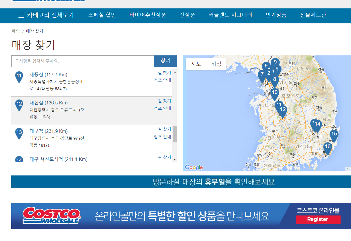 세종점, 대전점, 대구점, 대구 혁신도시점 등이 있으니 참고하시고요. 코스트코 홈페이지 매장 찾기에서 해당 매장의 '점포 안내'를 누르면 영업시간을 확인할 수 있습니다.