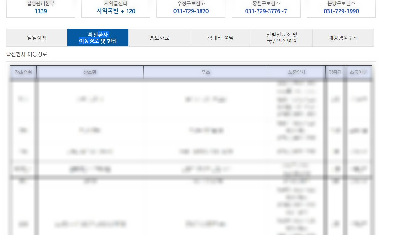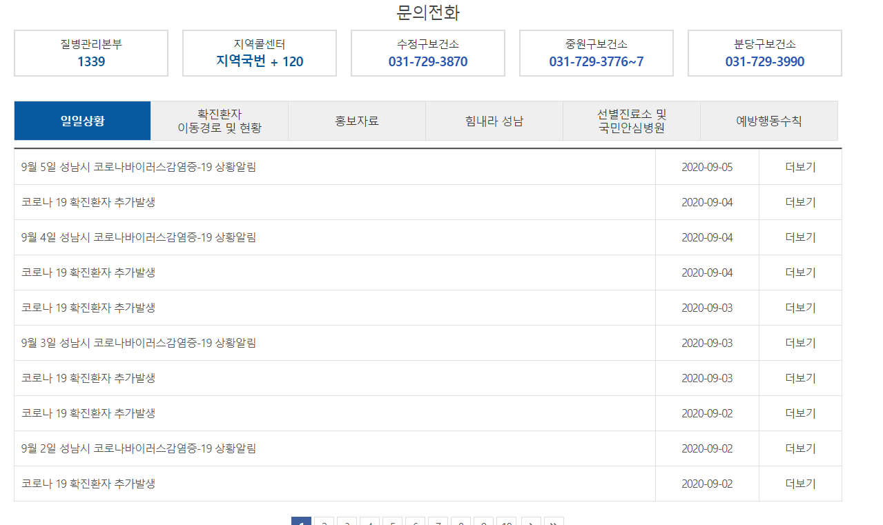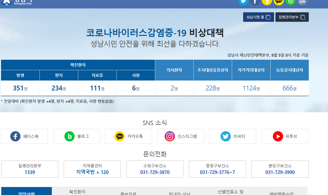 성남 코로나 바이러스 확진자 일일상황도 볼 수 있고요. 문의전화는 위 사진을 참고해주세요. 질병관리본부, 지역콜센터, 수정구보건소, 중원구보건소, 분당구 보건소의 전화번호를 확인하시기 바랍니다.