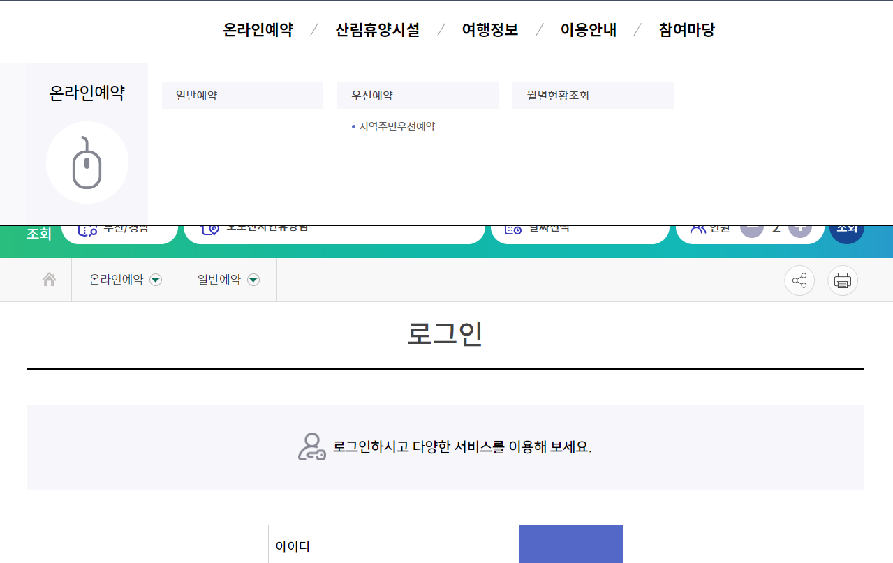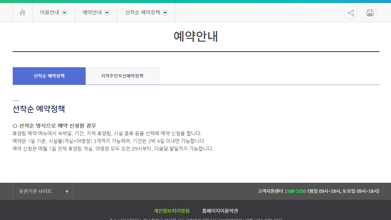 일반예약, 우선예약(지역주민우선예약)을 할 수 있으며 월별현황도 조회할 수 있습니다.