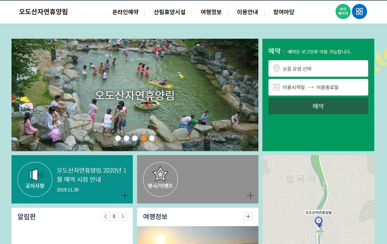 합천 오도산 자연휴양림 홈페이지에서는 온라인으로 예약을 할 수 있어요. 그리고 산림휴양시설에 대한 정보도 확인할 수 있고요. 주변 여행정보도 볼 수 있습니다.