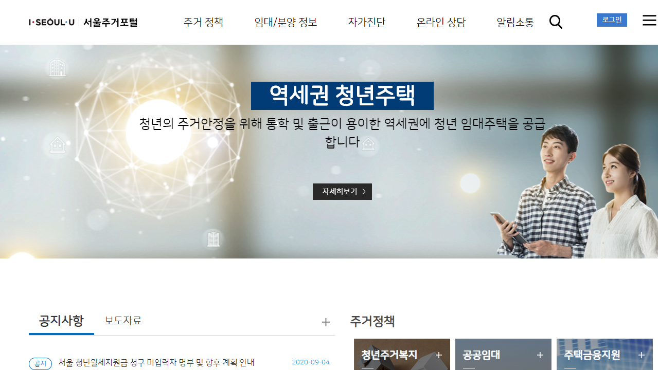 서울주거포털 홈페이지에서는 주거 정책이나 임대 분양 정보를 확인할 수 있는데요. 요즘 집구하기가 하늘에 별따기라고 할 정도로 힘들죠. 특히 돈이 없는 청년들에게는 더더욱 그렇습니다.