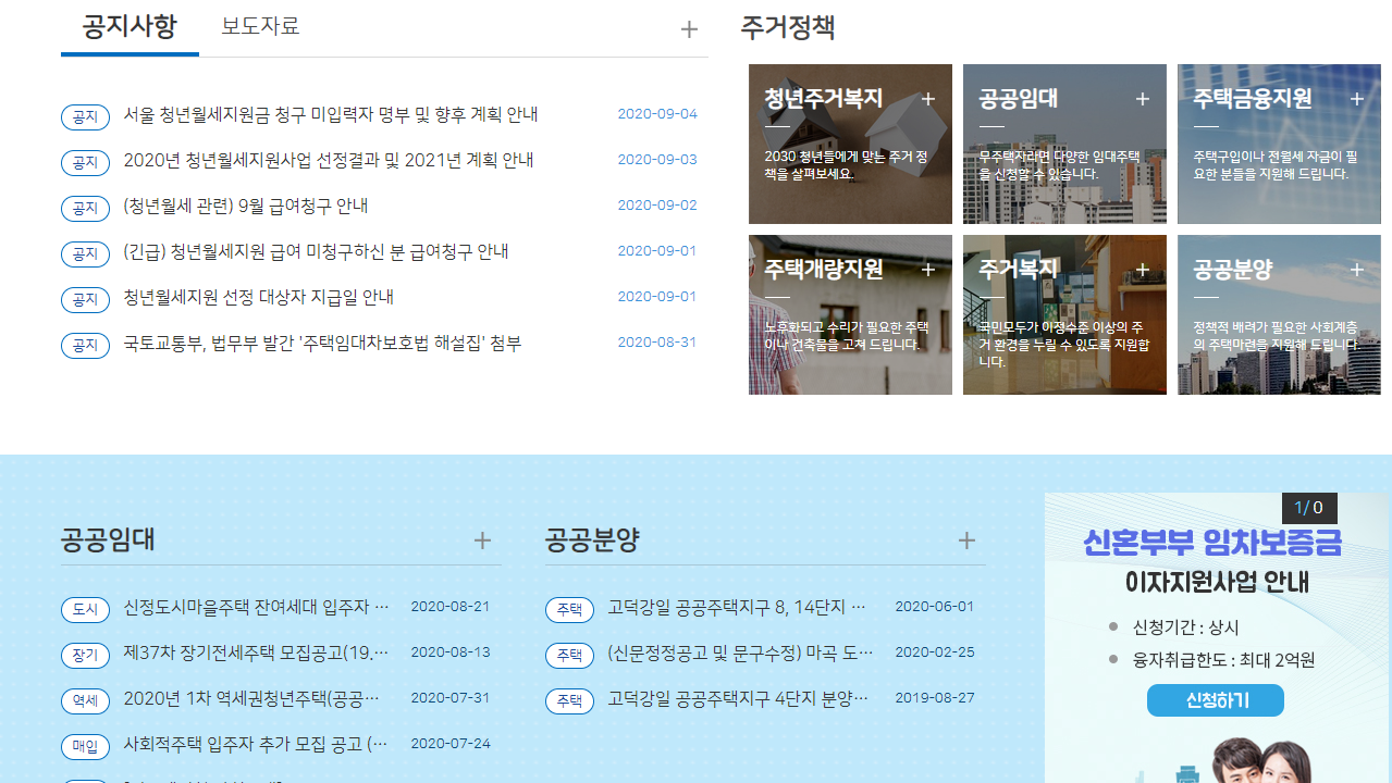 공지사항을 확인해보시면 청년월세 관련 9월 급여청구 안내 등을 확인할 수 있어요. 그리고 최근에 청년월세지원 대상자도 발표했는데 확인해보세요. 저는 떨어졌네요 ㅠㅠ