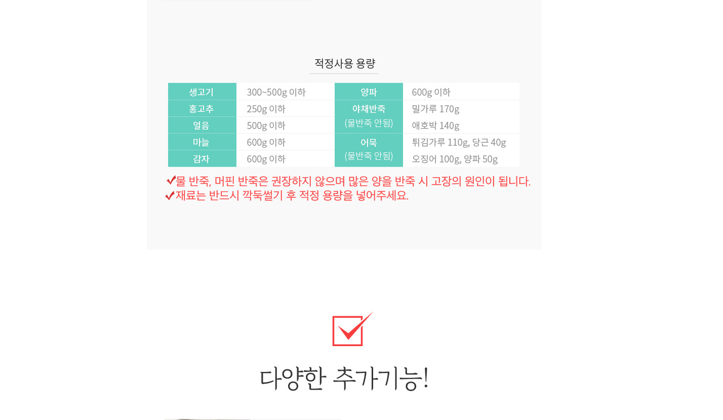 에버홈 글라스텐 다지기의 적정사용 용량 참고하시고요~ 생고기, 홍고추, 얼음, 마늘, 감자, 양파, 야채반죽, 어묵의 적정사용 용량입니다.