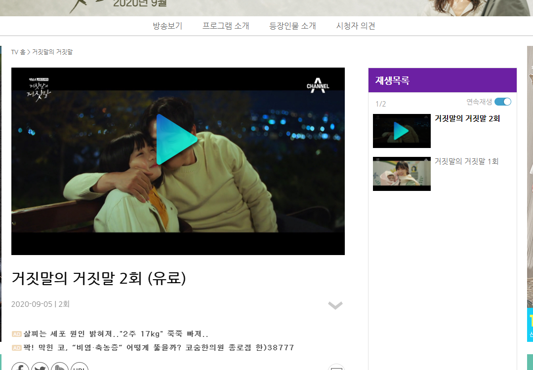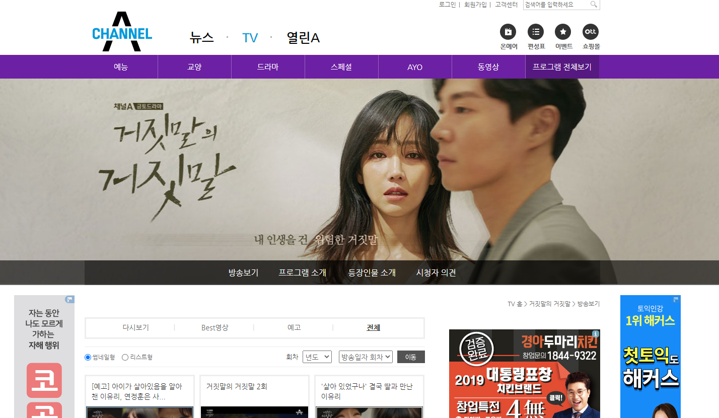 채널A 홈페이지에서는 이렇게 금토드라마 거짓말의 거짓말 재방송 보기가 있고 예고편도 있습니다.