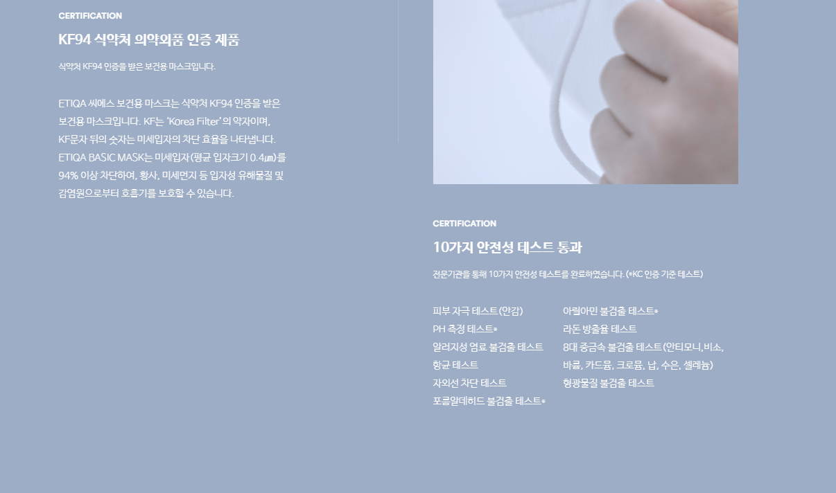 식약처 의약외품 인증 제품이기도 하고요. 미세입자(평균 입자 크기 0.4)를 94% 이상 차단해준다고 해요. 피부 자극 테스트, PH 측정 테스트, 알러지성 염로 불검출 테스트, 향균 테스트, 자외선 차단 테스트, 포름알데히드 불검출 테스트, 라돈 방출율 테스트 등의 10가지 안전성 테스트를 통과한 제품입니다.