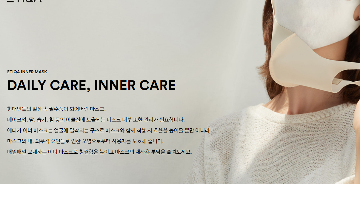 화장을 하시는 남성분들이나 여성분들은 마스크를 착용하면 불편한 것이 있는데요. 메이크업, 땀, 습기, 침 등의 이물질이 마스크에 뭍는다는 것입니다. 에티카마스크의 이너 마스크를 통해서 청결하게 마스크를 관리하고 착용할 수 있어요.