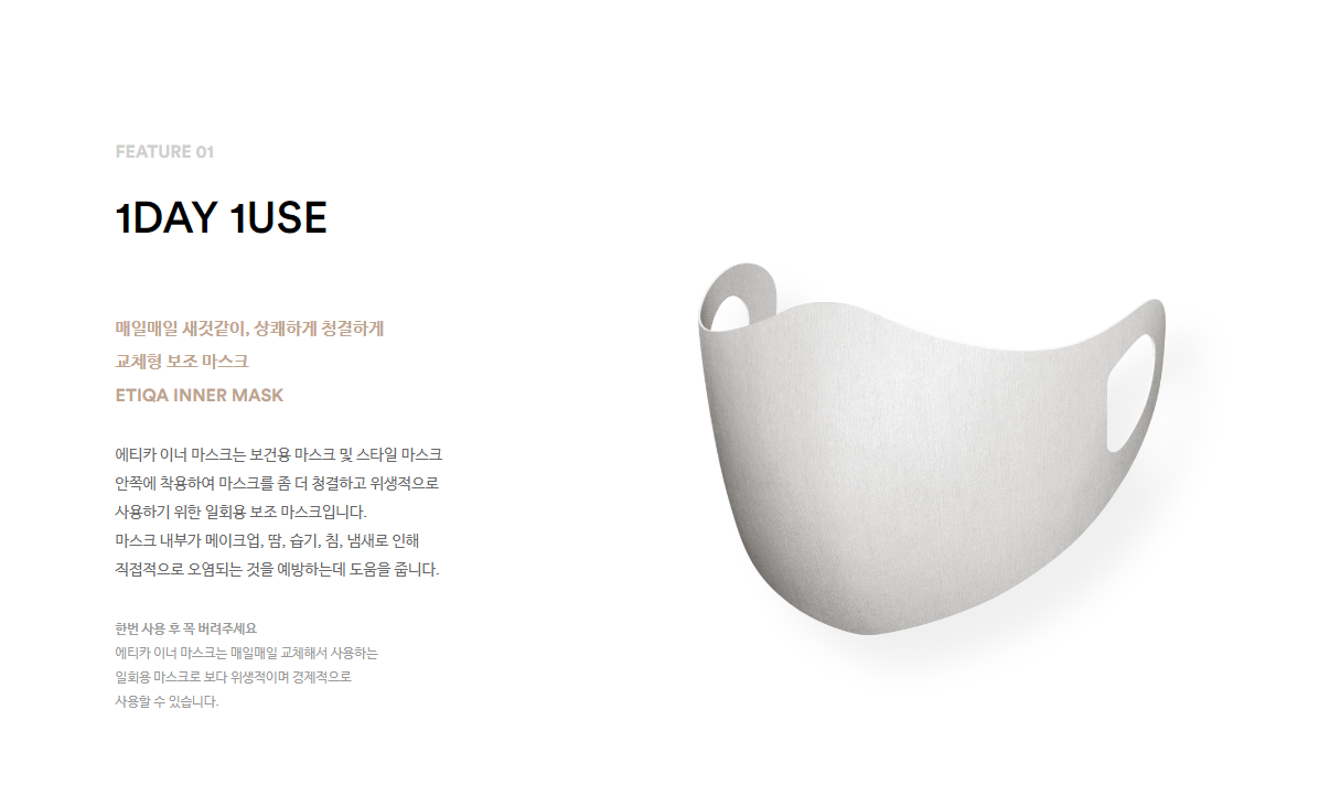 화장을 하시는 남성분들이나 여성분들은 마스크를 착용하면 불편한 것이 있는데요. 메이크업, 땀, 습기, 침 등의 이물질이 마스크에 뭍는다는 것입니다. 에티카마스크의 이너 마스크를 통해서 청결하게 마스크를 관리하고 착용할 수 있어요.