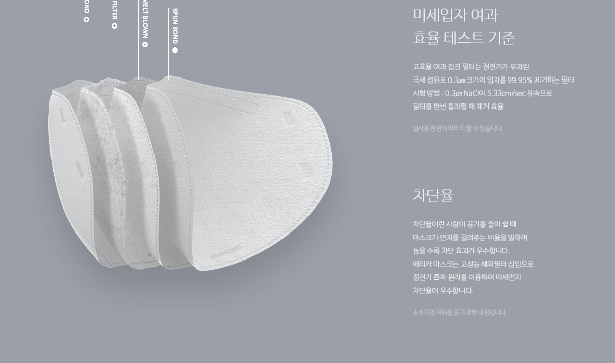 식약처 의약외품 인증 제품이기도 하고요. 미세입자(평균 입자 크기 0.4)를 94% 이상 차단해준다고 해요. 피부 자극 테스트, PH 측정 테스트, 알러지성 염로 불검출 테스트, 향균 테스트, 자외선 차단 테스트, 포름알데히드 불검출 테스트, 라돈 방출율 테스트 등의 10가지 안전성 테스트를 통과한 제품입니다.