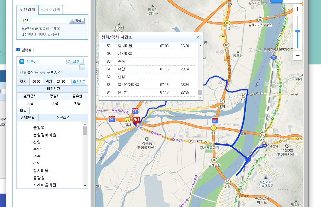 저는 부산 125번 버스를 검색해봤어요. 김해불암동에서 구포시장까지의 노선인데요.