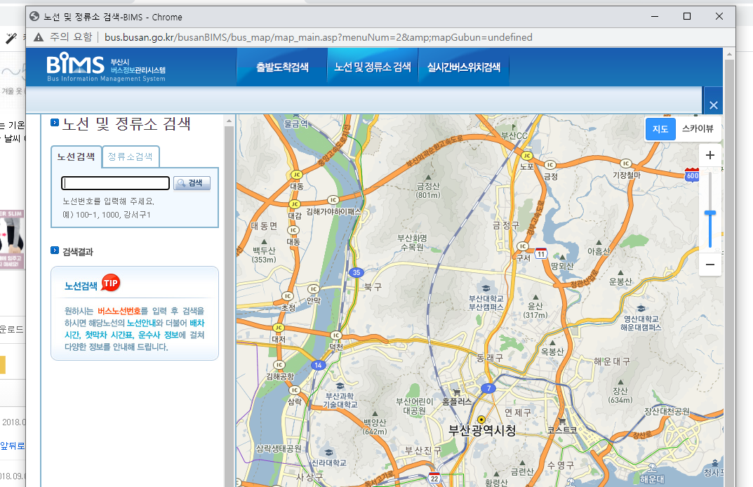 노선 및 정류소 검색을 해보겠습니다. 여기에 부산 시내버스 번호를 입력하시면 노선 안내와 함께 배차시간, 첫차 시간표, 막차 시간표, 운수사 정보를 확인할 수 있습니다.