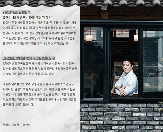 유현수 LA갈비 구매링크는 글 하단에 있고요. 60여년 전 경상남도 밀양에서 두레라는 곳을 문을 열었다고 하는데요. 한국의 전통 음식에서 이어지는 맛과 멋을 담아내고자 노력하고 있다고 해요. 사찰식의 채소요리법과 전통 한정식 그리고 뉴코리안의 조합으로 만들어진 한국 계절 미식 다이닝.