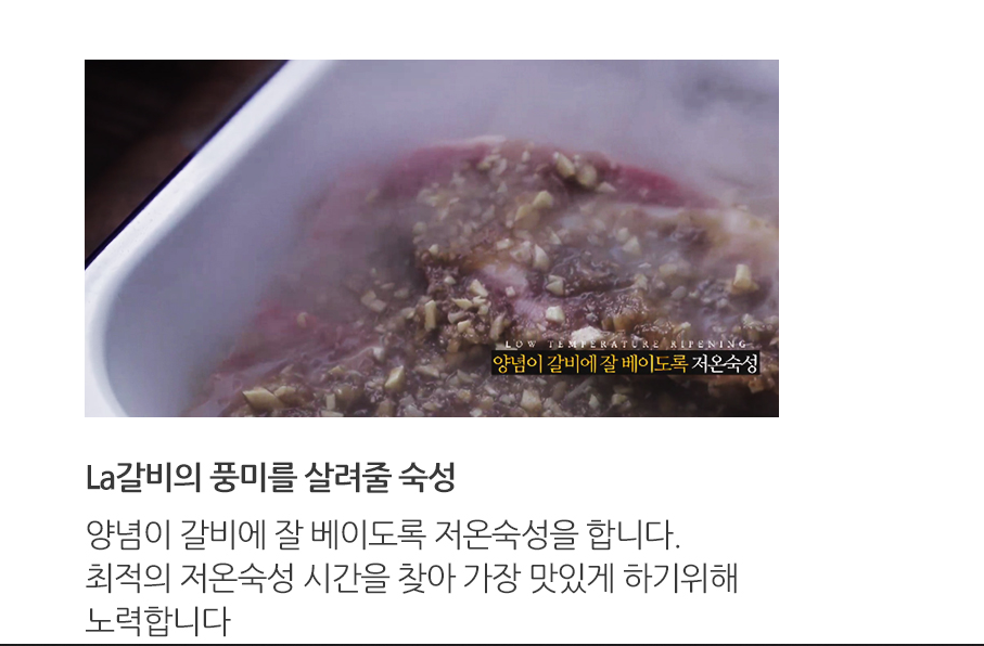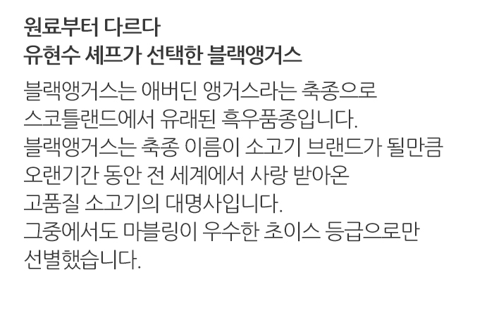 유현수 LA갈비는 블랙앵거스라는 품종으로 만들어졌는데요. 스코틀랜드에서 유래된 흑우 품종으로써 고품질 소고기로 널리 알려졌다고 하네요. 마블링이 우수한 초이스 등급으로 만들어졌다고 해요.