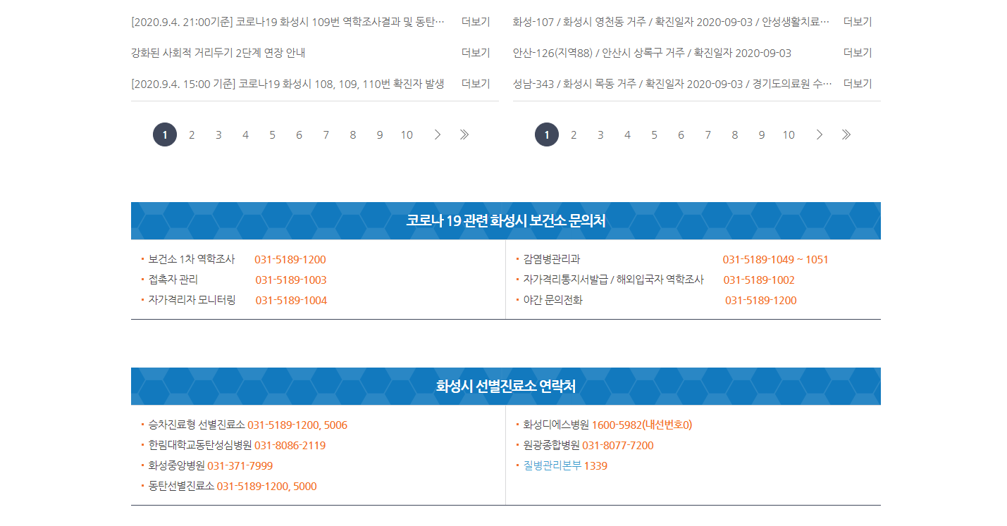 화성시 코로나19 대응 지원 상황판입니다. 이동경로 (동선)을 파악하실 때 한 번 보시는 것도 좋겠네요.